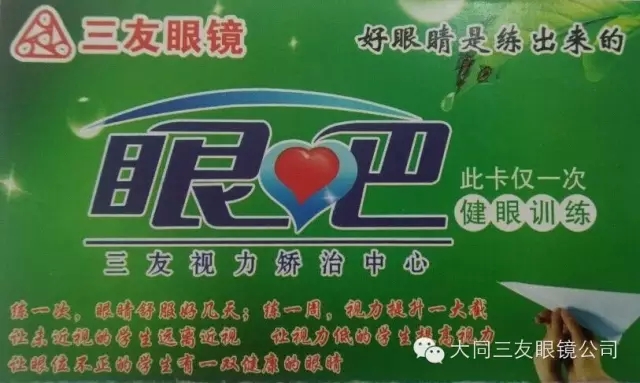 三友眼镜教你健康用眼,练就“火眼金睛”。眼吧是解决青少年近视弱势的专业机构,集中小学生的视力普查,预防,保健于一体,练一次眼睛舒服好几天;练一周,视力提升一大截.让未近视的学生远离近视,让视力低的学生提高视力,让眼位不正的学生有一双健康的双眼。值此新春来临,三友眼镜竭诚为您服务,只要进店顾客就赠送您一张眼吧体验卡,给您的双眼做一次免费的“有氧SPA”