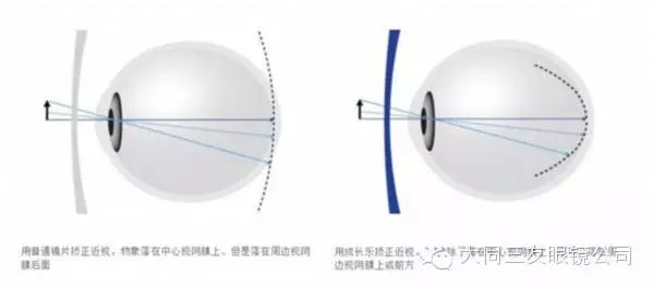 普通:用普通单光镜片矫正的近视眼,中心部位图像投射在视网膜上,但其周边部位却投射在视网膜后方。