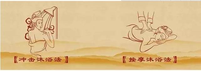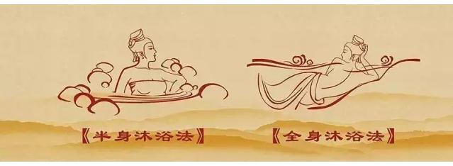 半身沐浴法:半坐于温泉池中,水面齐胸口,可手持木勺将温泉水浇淋全身。