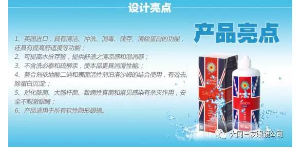 沙福隆具有清洁、冲洗、消毒、储存、清除蛋白的功能,还具有提高舒适度等功能。可提高水份存留,提供舒适之清凉感和湿润感;对化脓菌、大肠杆菌、致病性真菌和常见感染有杀灭作用,安全不刺激眼睛;是一个清洁、消毒、杀菌等功能全面的产品。沙福隆的研发团队,拥有多年隐形眼镜和隐形眼镜护理产品研发生产经验,先后获得多项专利,沙福隆自以来,一直坚持所有产品,都通过专业人士销售。